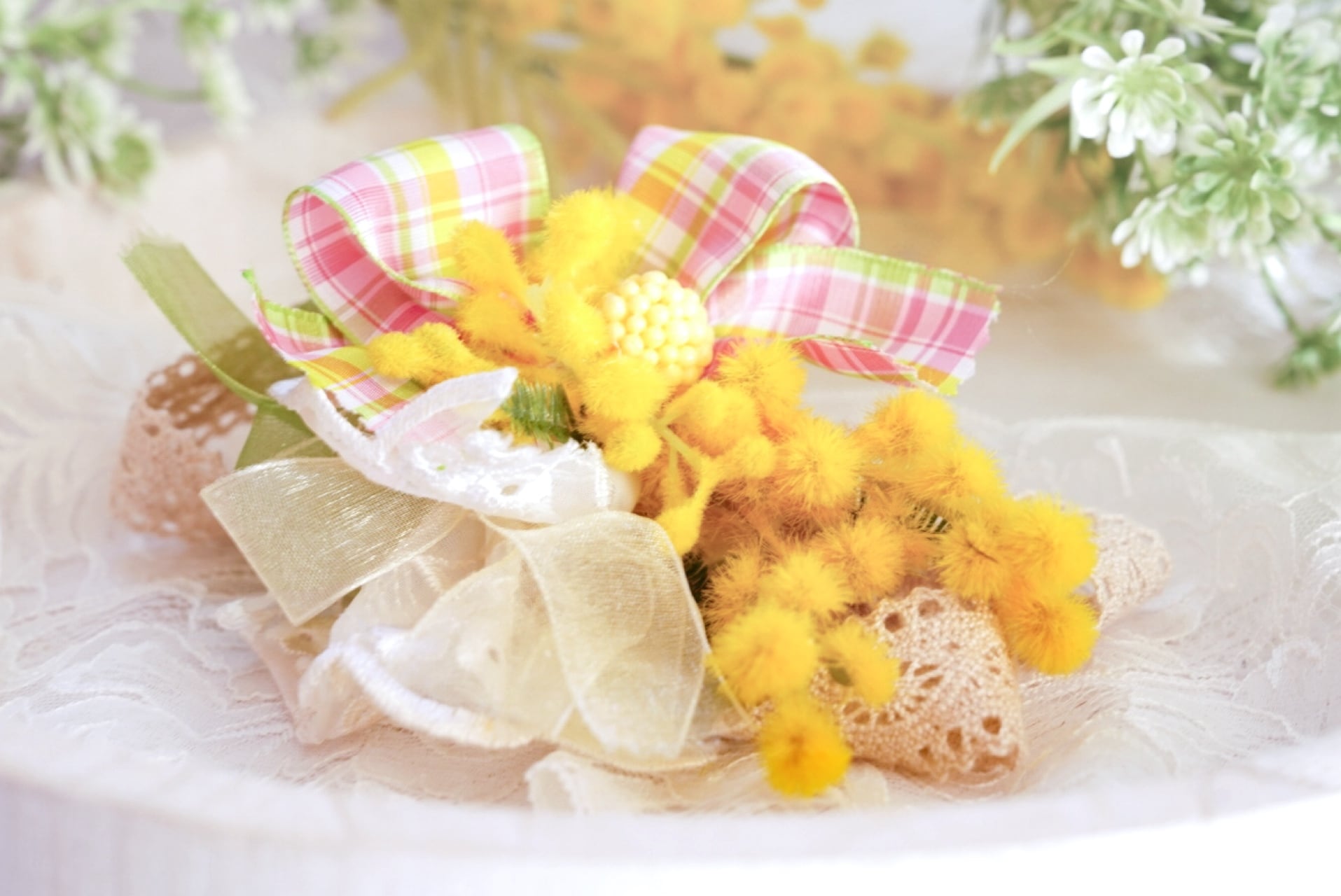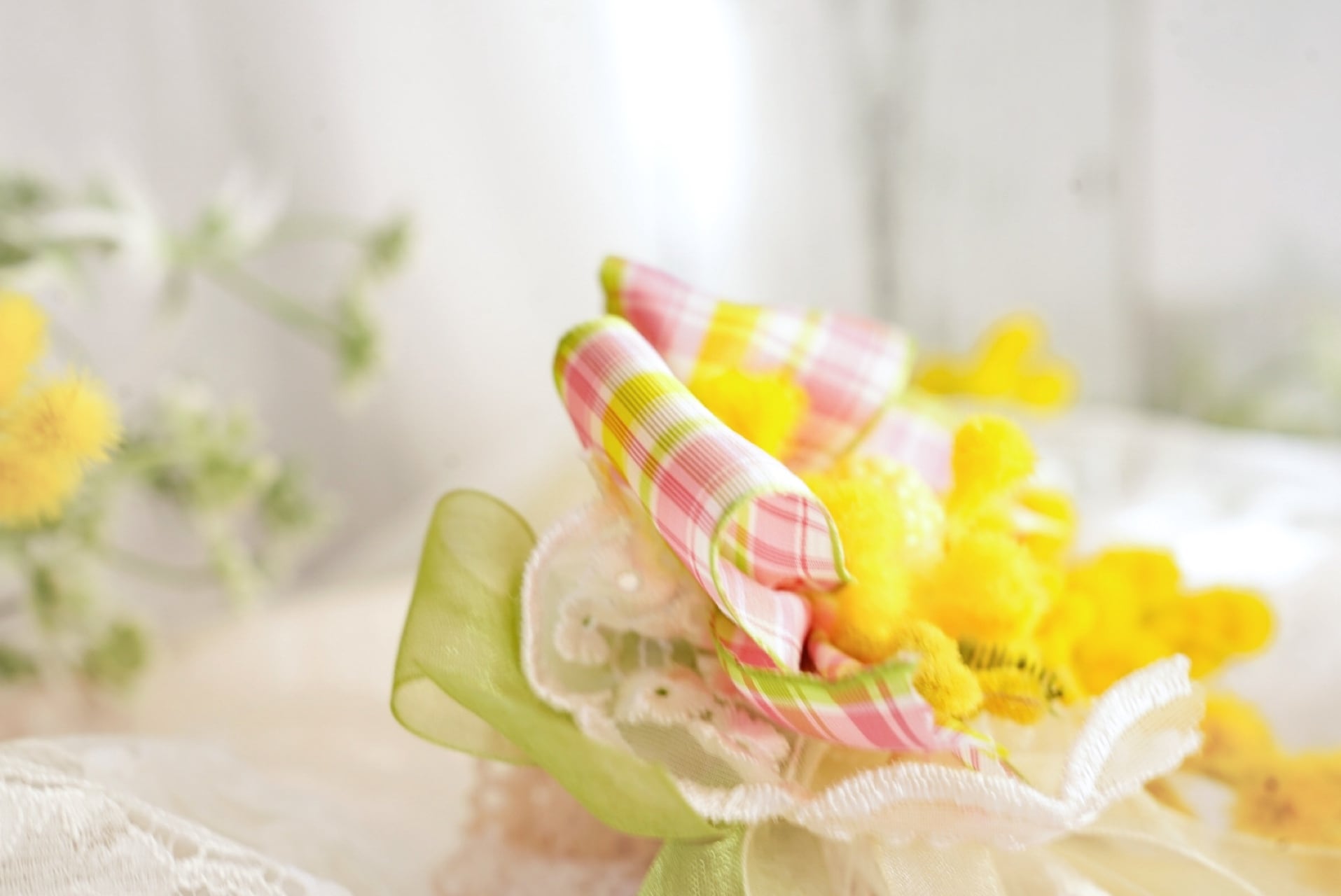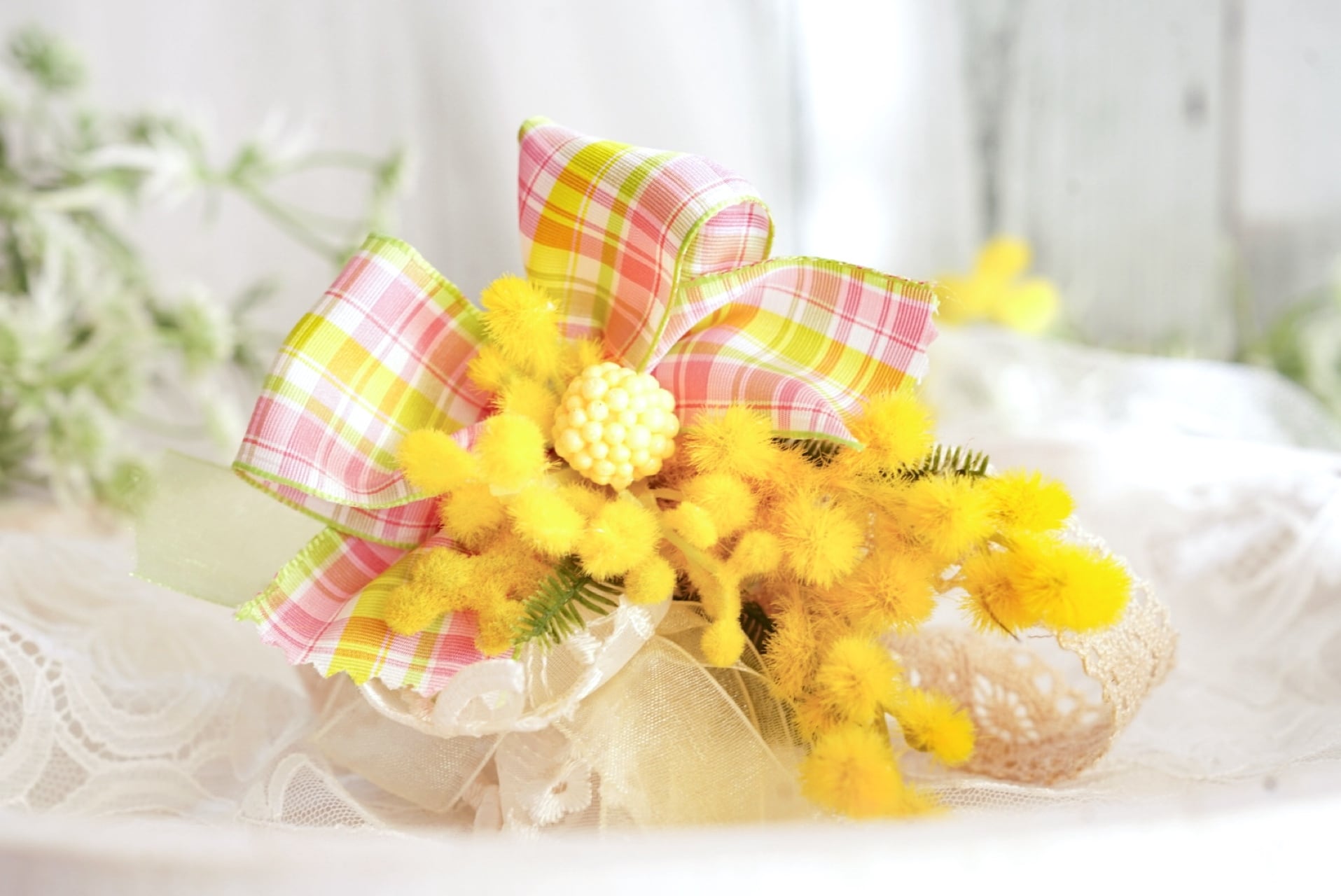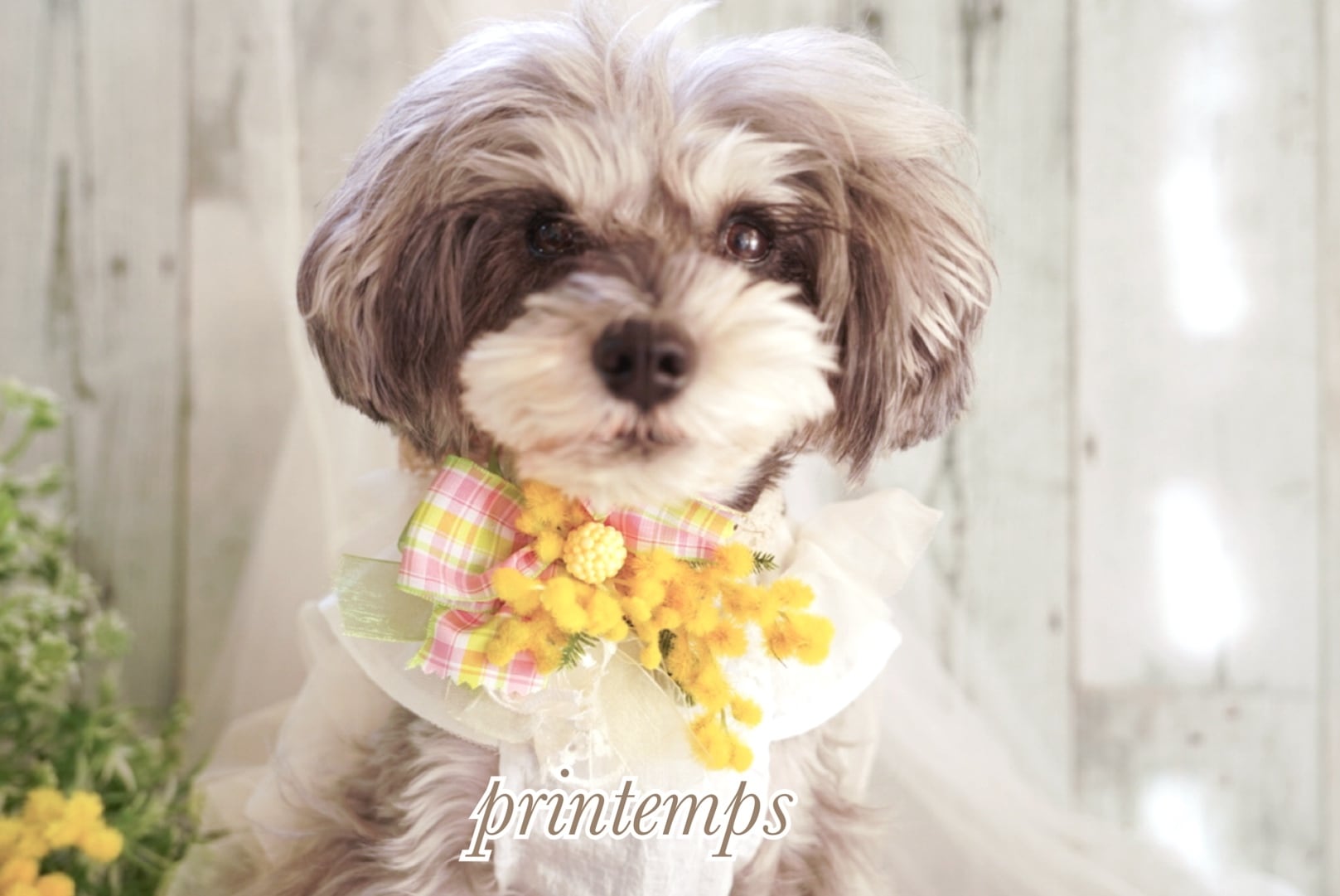 明るい春カラーのリボンに、鮮やかなミモザのデザインが施されたペット用チョーカーです♡