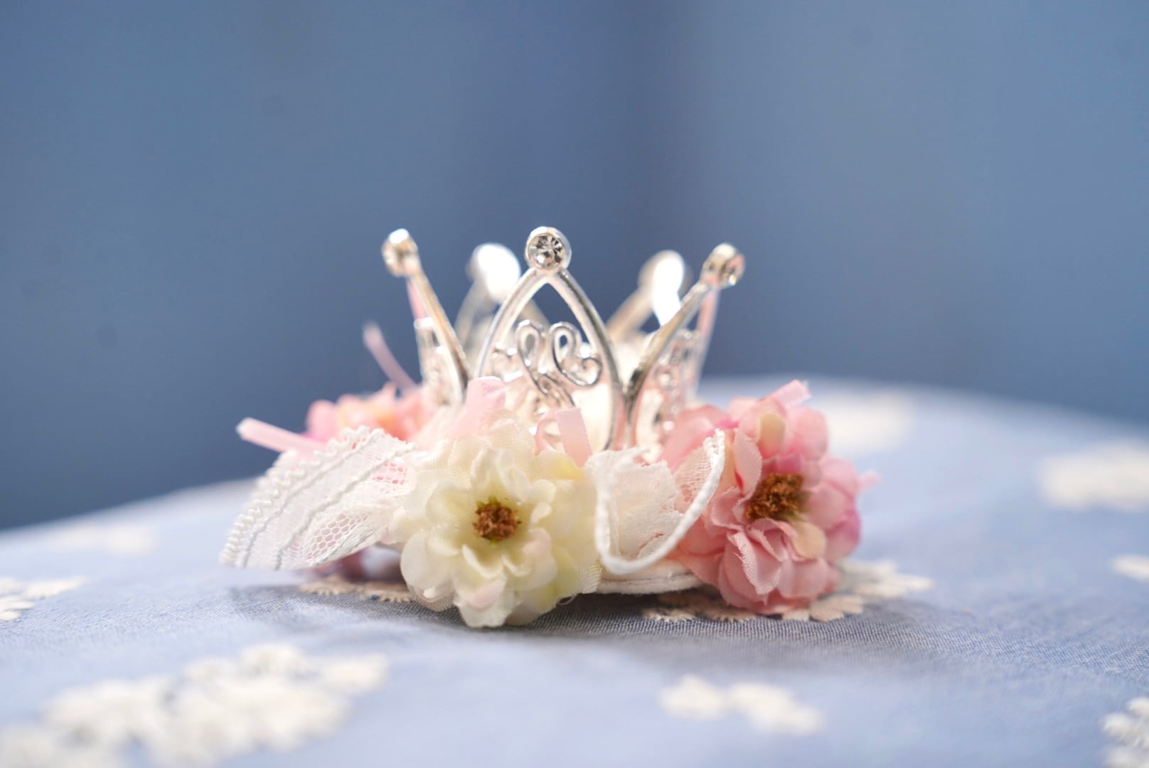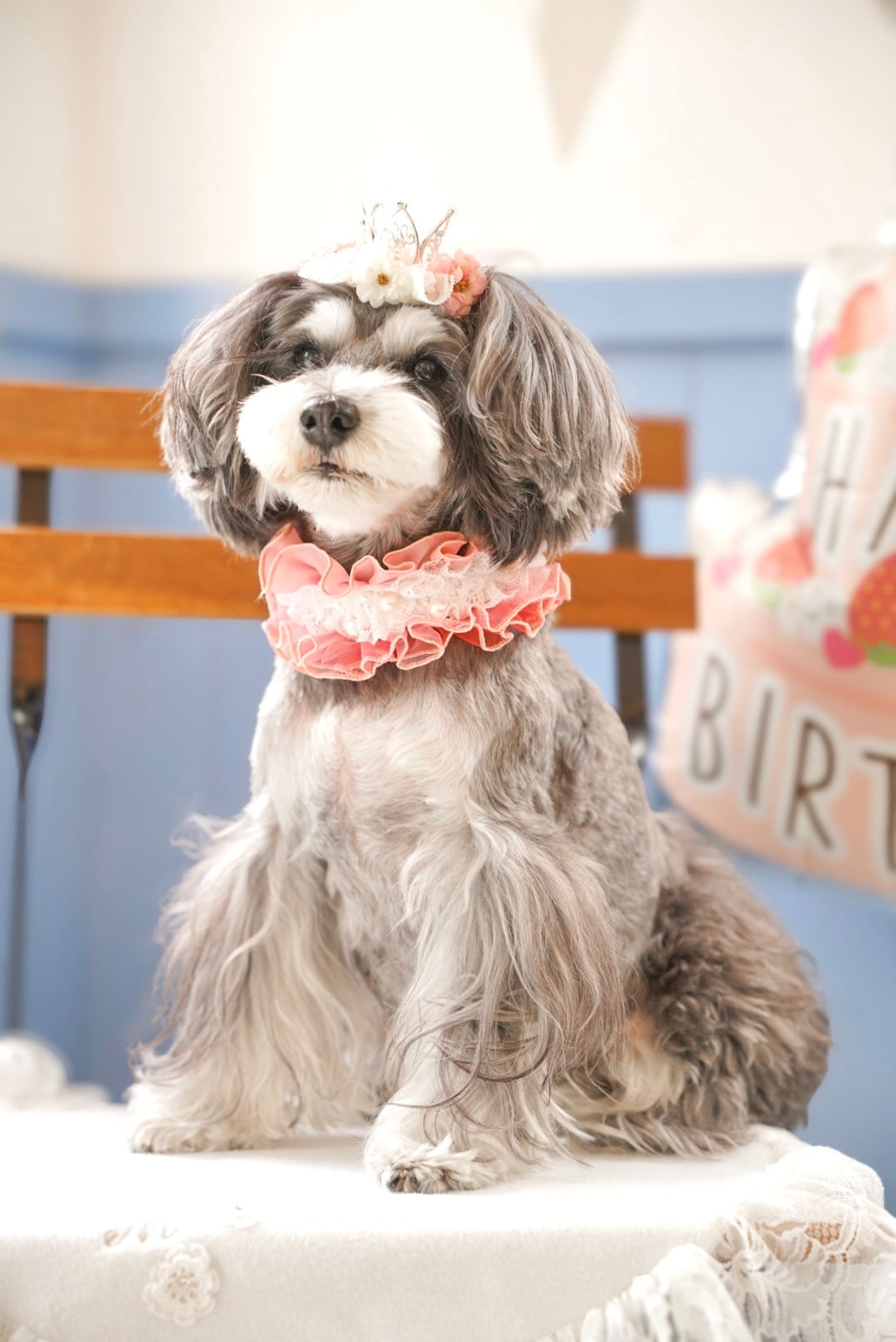 このセットには、可愛いピンクのクラウンとフリルのチョーカーが含まれています。可愛い小花、リバーレース、おリボンでまわりを埋め尽くしたクラウン(プラスチック)。チョーカーはコットンパールやビーズがあしらわれており、上品かつ華やかさを演出します。大切なペットの記念日をさらに素敵に演出するアイテムです。