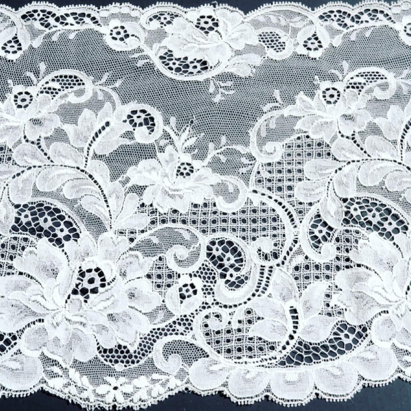 幅23㌢のフランス製リバーレースを贅沢に使ったスヌードです。幾種類もの細い糸が織りなすレース模様にウットリしちゃいます♡上下にゴムを通してレースの美しさを損なわずに5㌢と3㌢のタックを作りました。用途に合わせてご利用ください^ ^